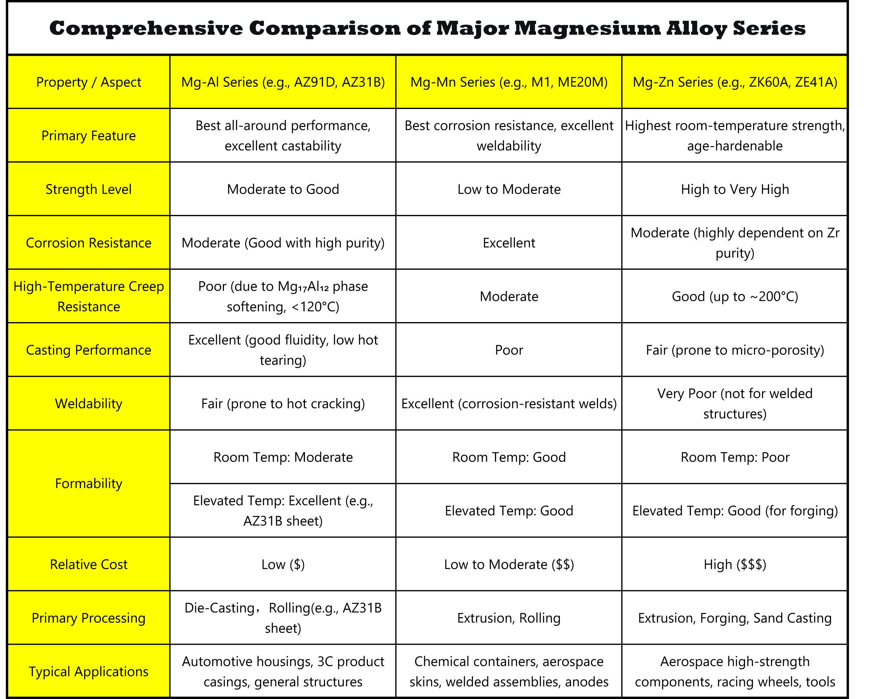 Magnesium alloys are primarily categorized based on their major alloying elements. The main systems are Mg-Al, Mg-Mn, Mg-Zn, and Mg-RE, each offering a unique set of properties tailored for specific applications.