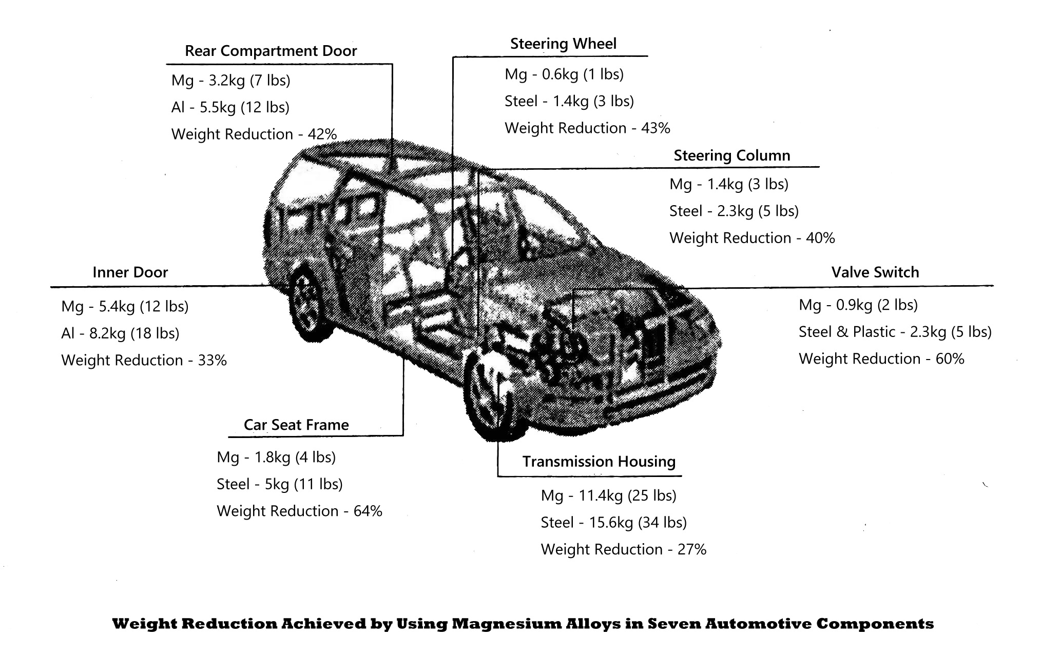 Weight Reduction Achieved by Using Magnesium Alloys in Seven Automotive Components
